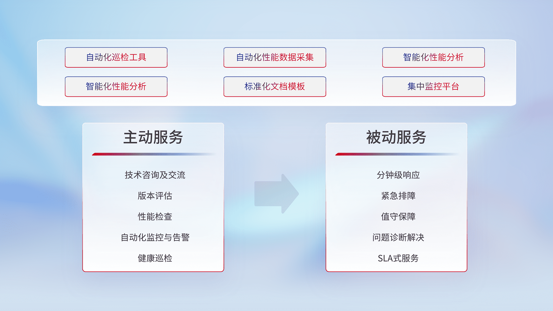 智能化工具和标准化文档,,保障服务质量,,,,提供主动服务(包含技术咨询、、版本评估、、、、性能检查、、、、自动化监控与告警、、、、健康巡检)和被动服务包含(分钟级响应、、、、紧急排障、、、、值守保障、、、、问题诊断解决、、、SLA服务)。。。。